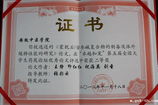 11月16-18日,第五届“全国大学生药苑论坛”在沈阳药科大学隆重举行。我校药学院2010级药物制剂专业王静等同学主持的项目《蒙脱石苦参碱复合物的制备及其体外缓释性能的研究》经过前期函评和现场ppt汇报,赢得了专家的较高评价,在激烈的竞争中喜获二等奖。这也是我校第三次荣获该殊荣,充分展示了我校学生较为全面的综合素质和创新能力。