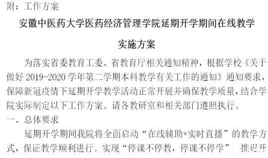 延期开学期间医药经济管理学院全面启动“在线辅助+实时直播”的教学方式,授课教师通过直播或者混合教学方式开展在线教学工作,通过在线教学平台、手机短信或者QQ、微信等方式实现教学互动和答疑。在线教学期间,教师认真准备,通过多种形式授课,学生保持通讯畅通,按时在线上课。“停课不停教,停课不停学”,推迟开学不停教学,推迟到校不停学习,保证学生学业不受疫情影响,教学质量标准不降低。