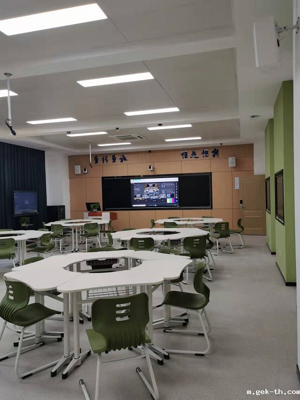 智慧教学区域配有交互式触控大屏装,多功能“智慧黑板”、全4K高清录播设备,无感扩声系统,可活动桌椅和触控式分屏。授课主机安装了智慧教学平台。教室可有效支撑线上线下混合式教学、翻转课堂,PBL教学、跨学科融合教学、案例教学等新型教学形式的开展,让教学从教室延伸到课外,实现在线学习、面对面教学的有机结合。智慧直播互动教室(二期)的建成,为服务现代化教学提供了有力支撑,为我校从传统多媒体教室教学向新型智慧教学空间逐步转型走出了坚实的一步。
