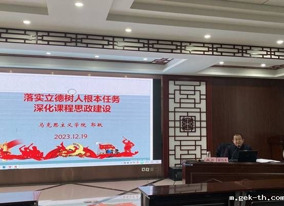 马克思主义学院副院长、郭跃教授作《落实立德树人根本任务 深化课程思政建设》的专题讲座。郭跃教授从课程思政的背景、内涵、设计内容等方面作了专题讲座。他强调“课程思政”是落实“立德树人”根本任务的重要举措,也是完善全员全程全方位“三全育人”的重要抓手,全体教师要提高对课程思政重要性和必要性的认识,不断加强政治理论学习,充分提升开展课程思政的自觉,加强对课程教学中思政元素的深度挖掘,提升专业课的课程思政能力,整合教学资源,创新教学方法,设计教学章节,春风化雨,润物无声,提高课程思政育人能力。